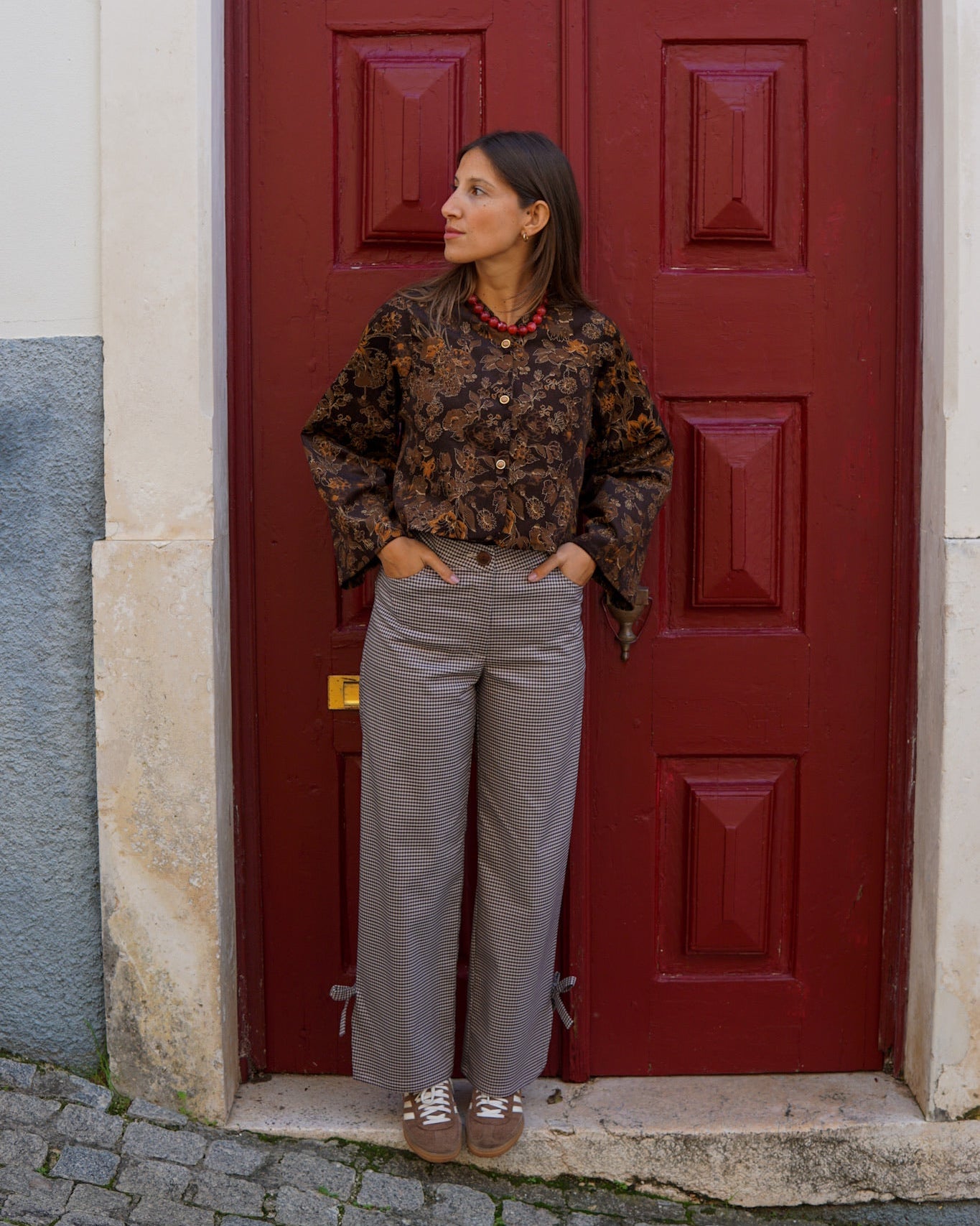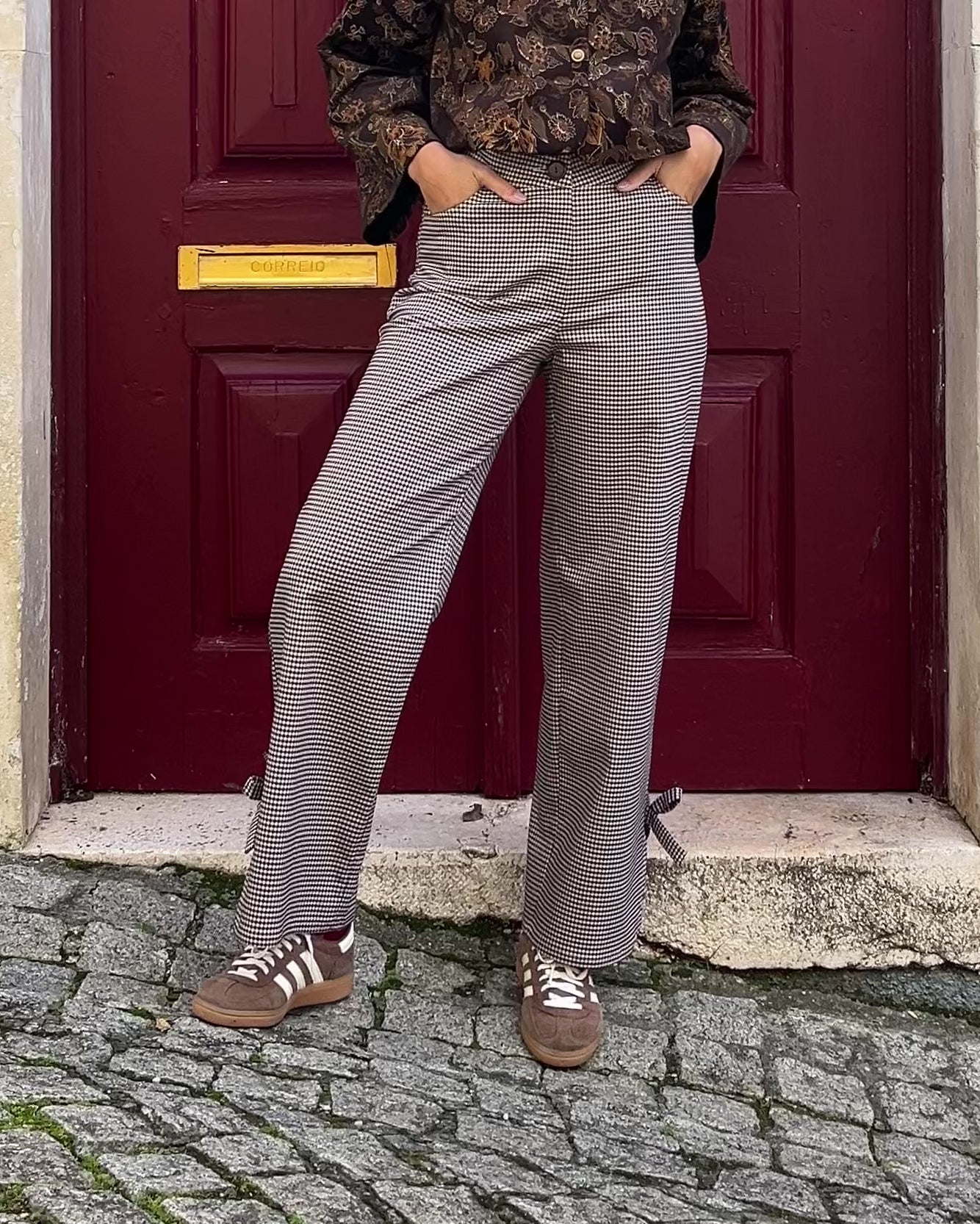 Calças com detalhe de laço, de corte direto e cintura subida. Uma peça repleta de detalhes para completar o teu armário.