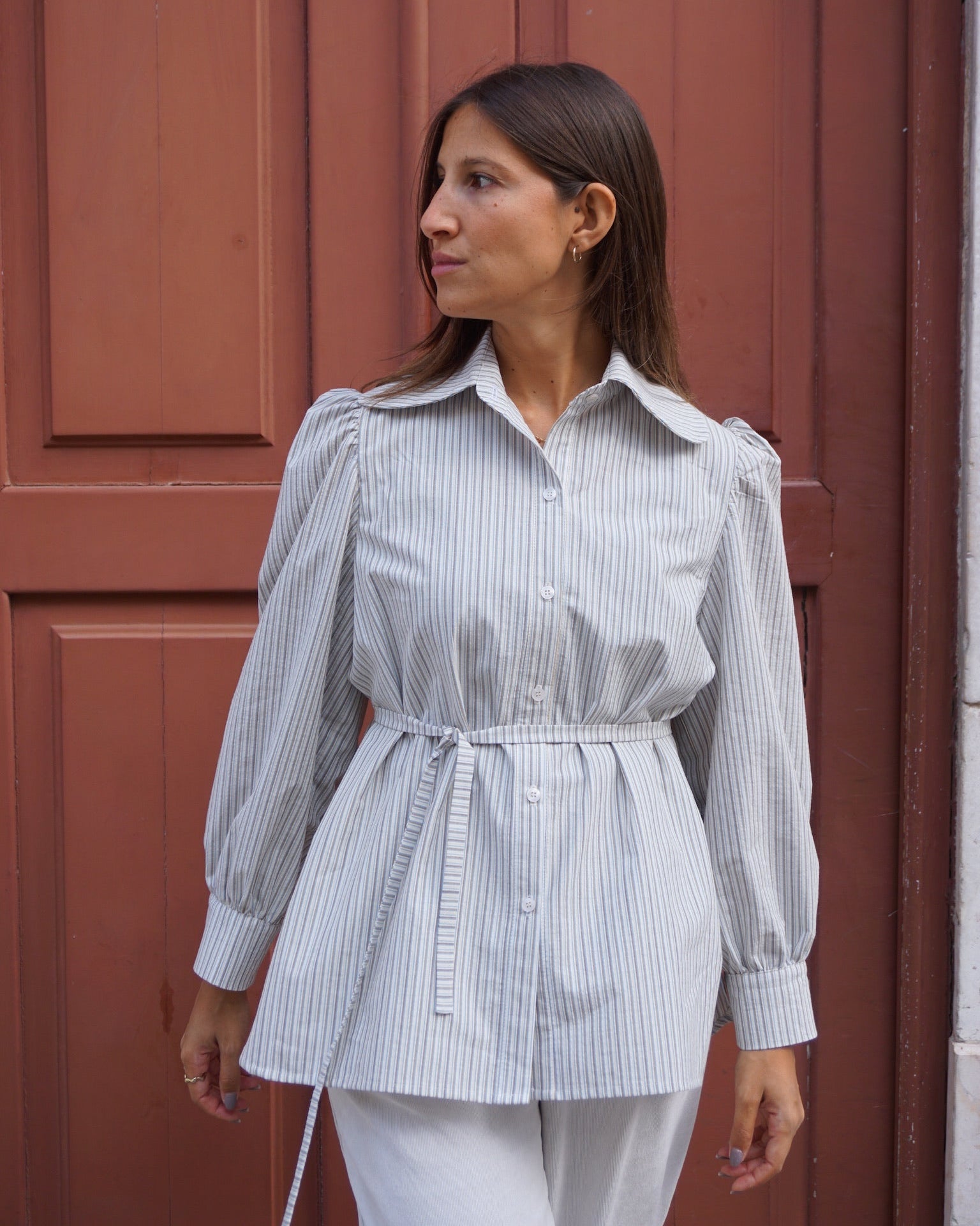 Camisa comprida às riscas, com manga balão e punhos. Uma conjunto descontraído e elegante que veio para oferecer conforto à estação.