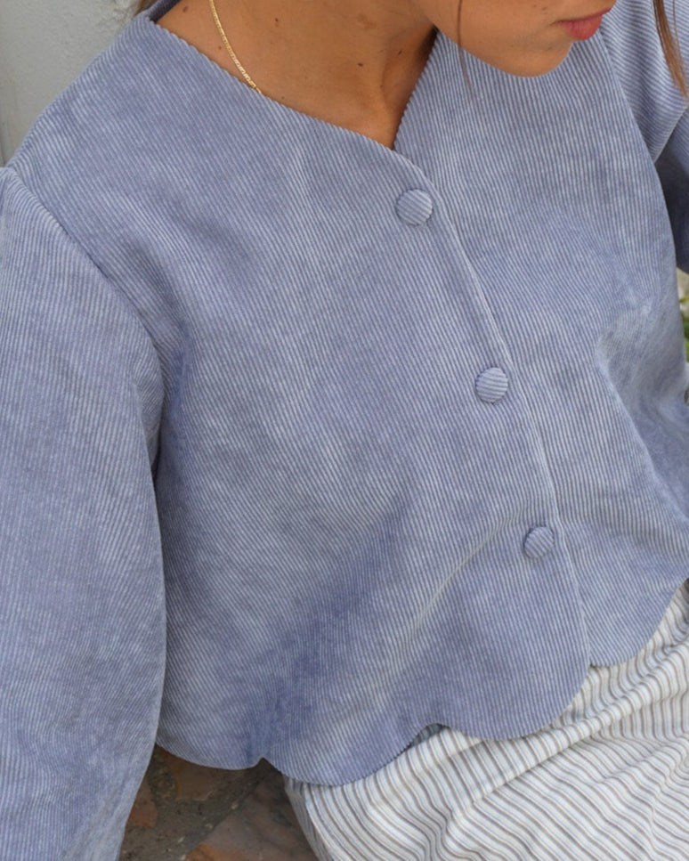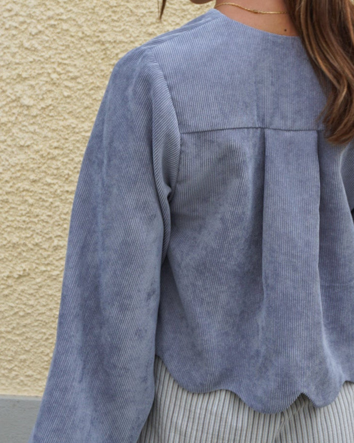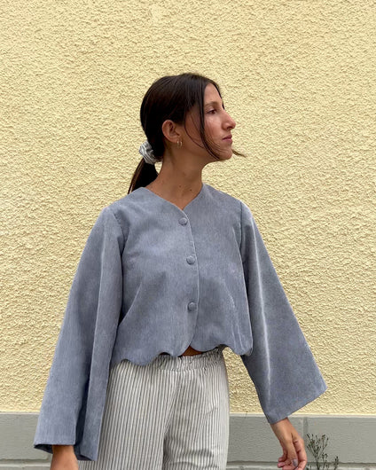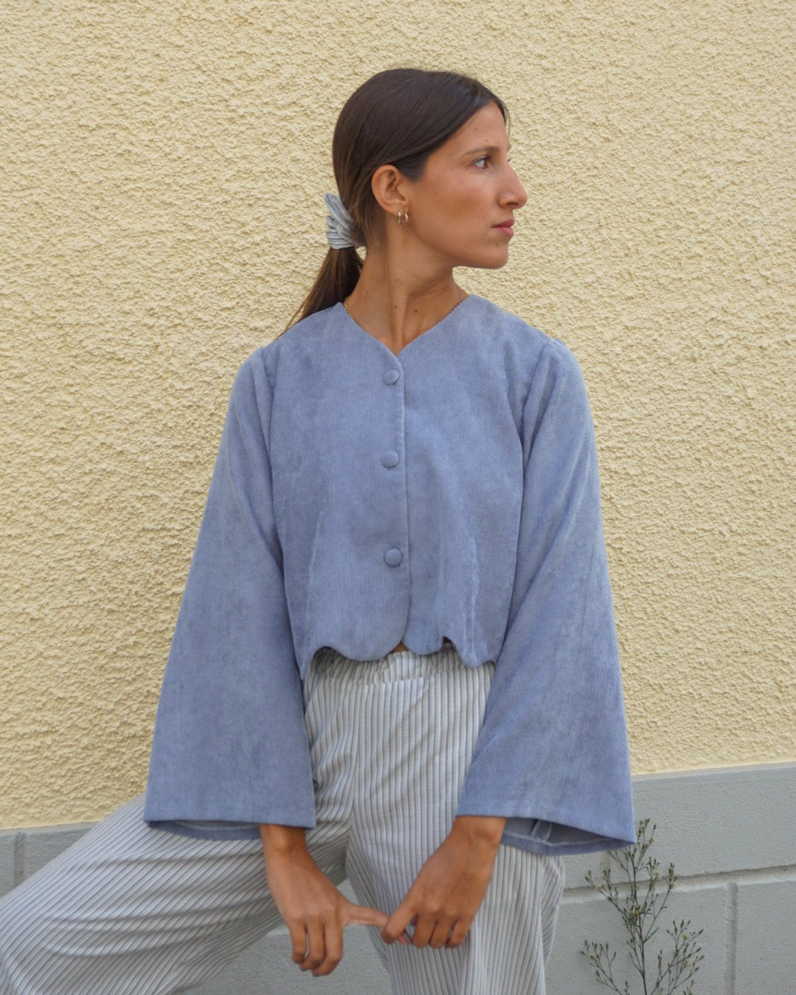 Camisa curta de bombazine de cana larga, com bolsos forrados e mangas largas.