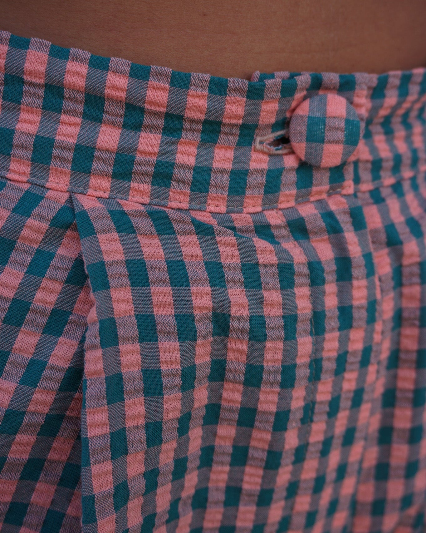 Calças vichy de algodão subidas, com botão forrado e bolsos. Um conjunto descontraído que vai oferecer conforto à próxima estação.